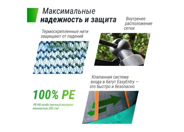 Каркасный батут с защитной сеткой безопасный подойдет для тренировок и просто для развлечений, он оснащен двусторонней молнией и дополнительными пластиковыми фиксаторами. Прыжки на батуте — это отличная аэробная нагрузка: улучшения общей физической формы, заряд положительными эмоциями, улучшение работы кардио системы, развитие чувства равновесия и координации, подойдет для пользователей любого возраста. Занятия на свежем воздухе укрепляют иммунитет, повышают выносливость. Прыжковое полотно создано из профессионального материала, преимуществом которого является возможность использования под открытым небом (не задерживает воду, не нагревается).